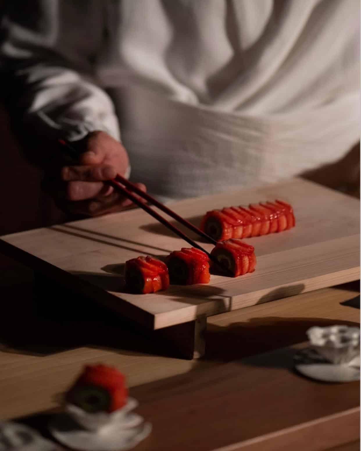 On perçoit le bruissement du couteau, le souffle du riz chaud, les gestes millimétrés du chef.