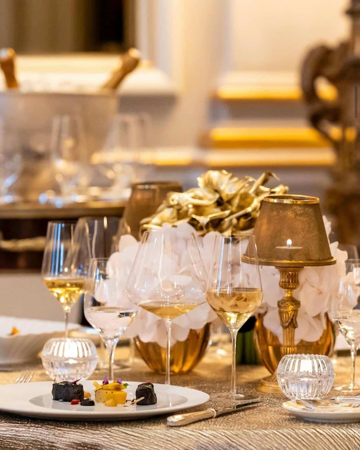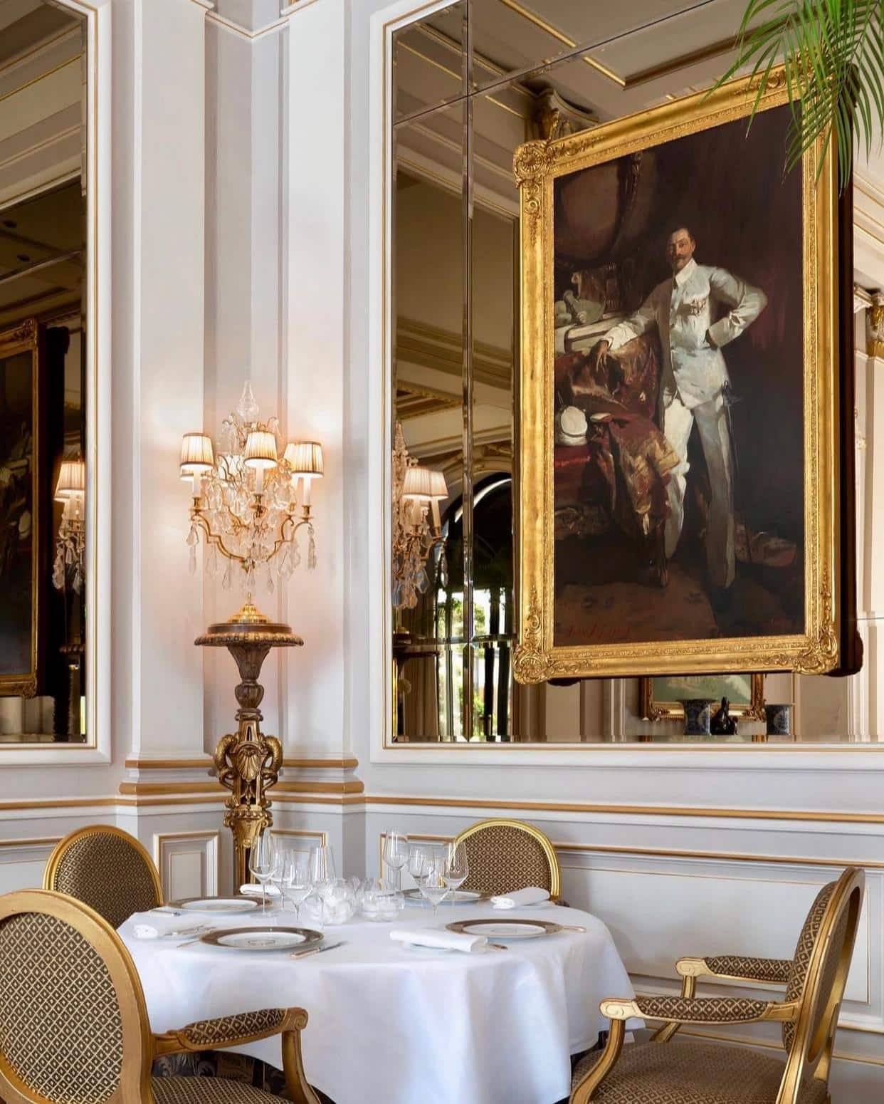 boiseries claires, dorures fines, lumière posée, textiles nobles, tables d’une sobriété parfaite.